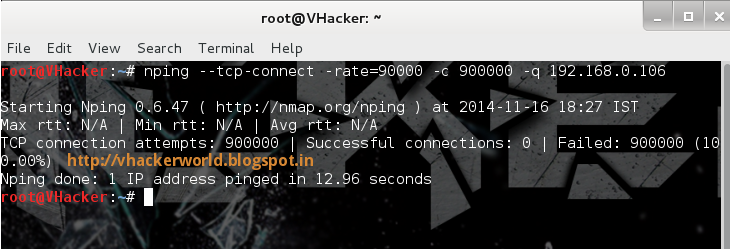 root@VHacker:~# nping –tcp-connect -rate=90000 -c 900000 -q 192.168.0.106